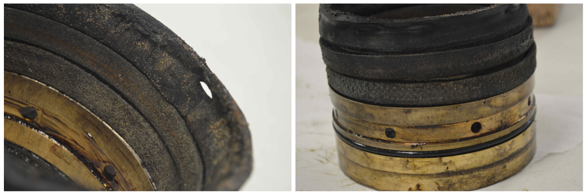 Improper torque shows up in two ways. If the nut is too loose, the rings separate and debris works into the gaps. If it is too tight, the packing compresses excessively, creating shiny wear bands from increased friction against the plunger. Both conditions accelerate wear.